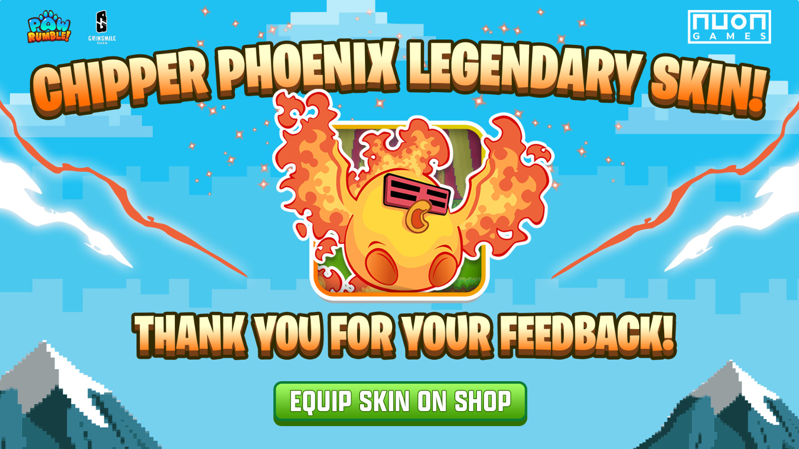 Selain mode game yang beragam, untuk memeriahkan full release, Paw Rumble menghadirkan promo New Player Bundle: Discount 25%! + Exclusive Character Chipper Shadow Ninja + 100 Star Ticket. Bagi user yang sudah mengisi feedback di masa Open Beta lalu, Nuon Games akan mengirimkan rewards ‘Phoenix Chipper’ melalui akun email yang sama digunakan untuk Log-in dalam fase Open Beta. Setelah berakhirnya fase Open Beta, dilakukan reset, dan setiap user yang melakukan login email pada saat Open Beta akan mendapatkan 200 Coins + 200 Star Ticket. Tidak hanya itu saja, bagi seluruh user yang sudah mengunduh Paw Rumble akan mendapatkan launch gift berupa 100 Coins + 100 Star Ticket.