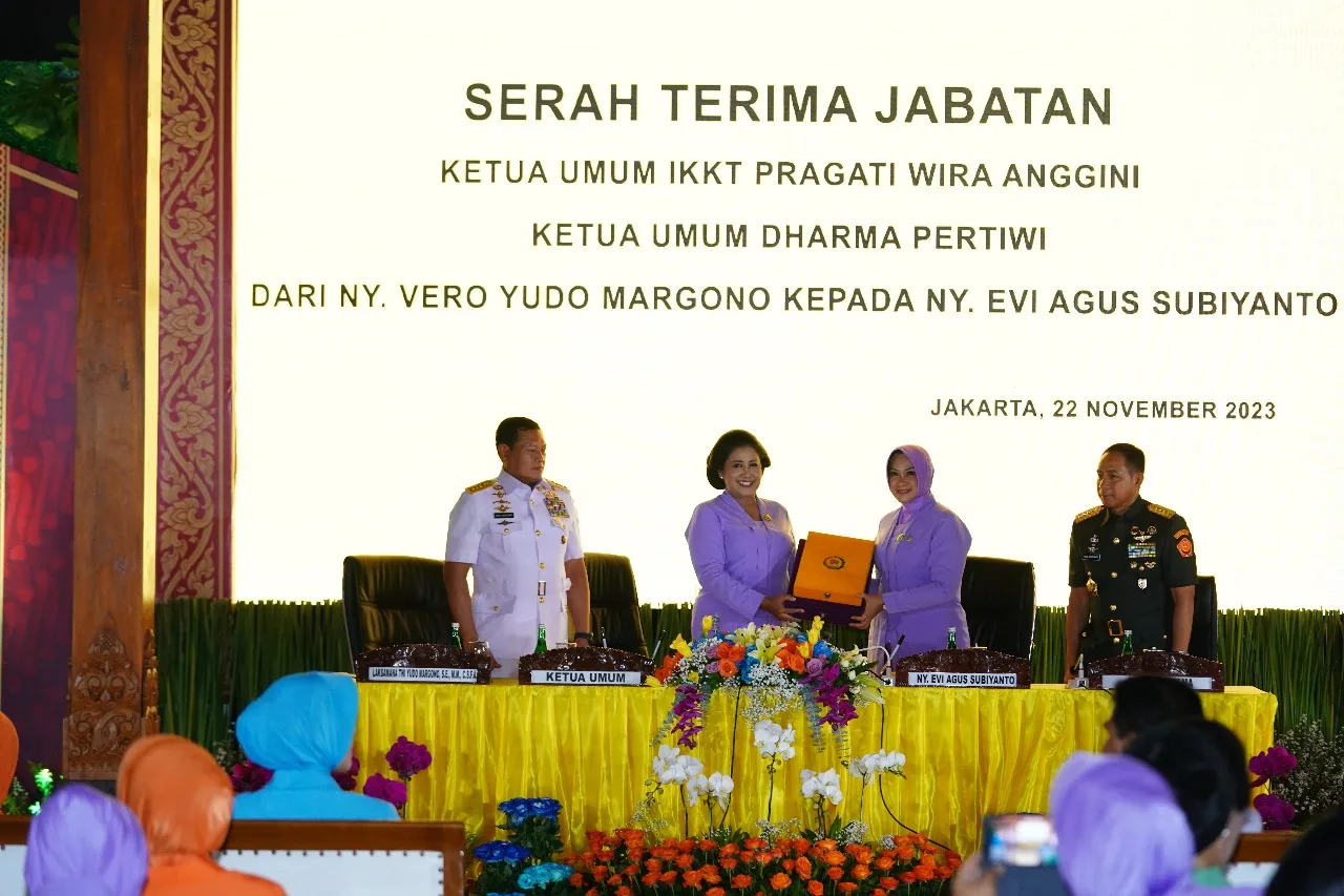 Jakarta (Puspen TNI) – Serah Terima Jabatan (Sertijab) Ketua Umum (Ketum) Ikatan Kesejahteraan Keluarga TNI (IKKT) Pragati Wira Anggini (PWA) dan Ketua Umum (Ketum) Dharma Pertiwi (DP) dari Ibu Vero Yudo Margono kepada Ibu Evi Agus Subiyanto dan Pengukuhan Ibu Raksa Tri Anggana Tantri, bertempat di Pendopo Ageng Besar Mabes TNI, Cilangkap, Jakarta Timur, Rabu (22/11/2023).