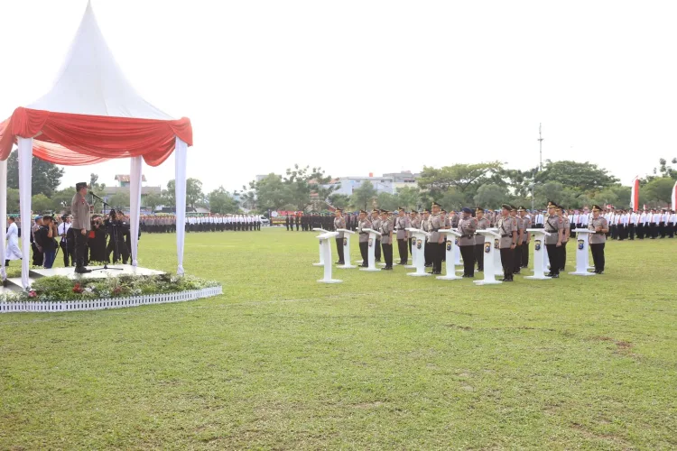 PEKANBARU – Kapolda Riau Irjen Muhammad Iqbal menghadiri upacara serah terima jabatan (sertijab) sejumlah perwira menengah (Pamen) dan pejabat tinggi (Pati) di halaman Mapolda Riau, Jumat (22/12/2023).