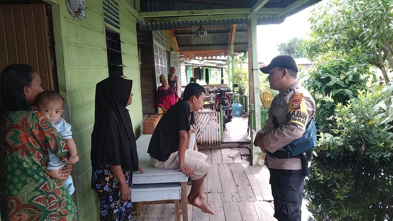 Banjir, Bhabinkamtibmas Polsek Bangko Tetap Semangat Patroli dan Sosialisasi Pemilu Damai