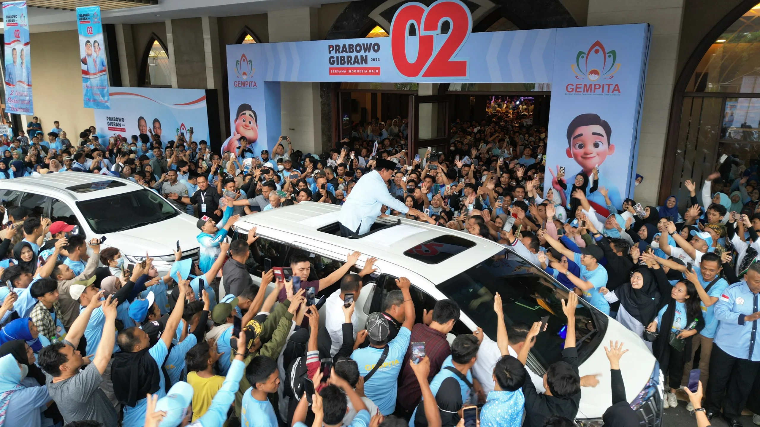 Setibanya Prabowo di acara deklarasi Gempita yang diselenggarakan di Sudirman Grand Ballroom pukul 13:42 WIB itu ia sudah dinanti oleh para pendukungnya yang kompak berbaju biru muda.