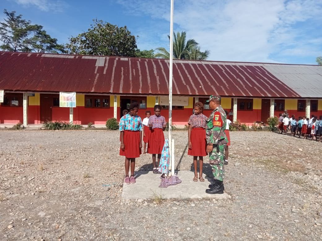 Timika – Tugas Babinsa adalah membangun sumber daya manusia yang cinta NKRI dan disiplin dalam menciptakan rasa nasionalisme yang tinggi pada setiap warga binaannya. Berbagai kegiatan pun dilakukan oleh Babinsa dalam mewujudkan hal tersebut sehingga faham-faham negatif diharapkan hilang dalam jiwa masyarakat. Mempedomani hal tersebut, Babinsa Koramil 1710-03/Kuala Kencana dipimpin Koptu Alfaris Kumiyu memberikan pelatihan PBB kepada siswa-siswi SD YPPK di Kp. Iwaka, Distrik Iwaka, Kabupaten Mimika, Kamis (18/01/2024).