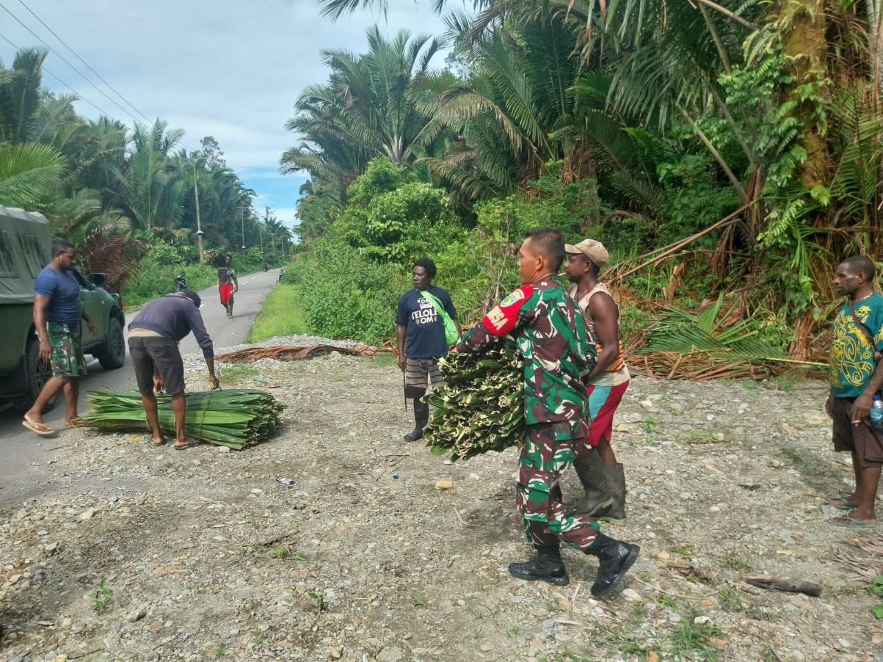 Timika – Acara adat di Papua bernilai sangat sakral dan sangat dihormati oleh masyarakat setempat. Sebagai aparat teritorial, Babinsa Koramil 1710-03/Kuala Kencana menyadari bahwa hal tersebut perlu dijaga demi kelestarian adat budaya sebagai kekayaan Indonesia. Mempedomani hal tersebut, kali ini Babinsa Koramil 1710-03/Kuala Kencana dipimpin Serka Noben Wenda bersama warga bahu membahu mengambil pelepah daun sagu, Rabu (24/01/2024).