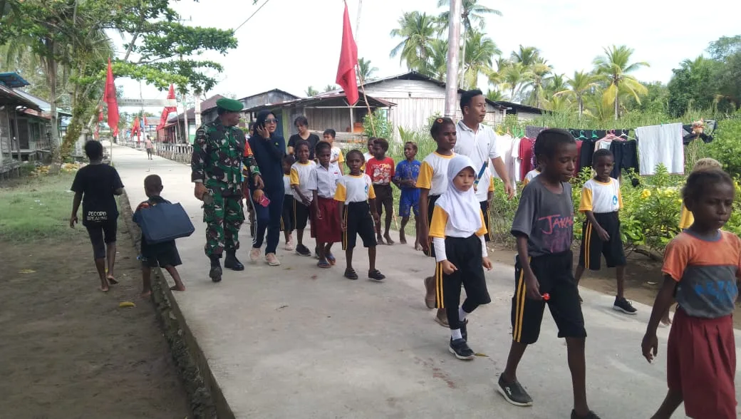 Timika – Babinsa Koramil 1710-01/Kokonao Sertu Romanus mengajak para siswa-siswi SDN 1 Kokonao Distrik Mimika Barat, Kab. Mimika, untuk berolahraga jalan santai pada saat mata pelajaran PJOK (Pendidikan Jasmani, Olahraga dan Kesehatan), Sabtu (27/01/2024). Dengan seijin kepala sekolah dan guru, Sertu Romanus mengajak siswa-siswi SDN Kokonao untuk refresing sekaligus berolah raga jalan santai.