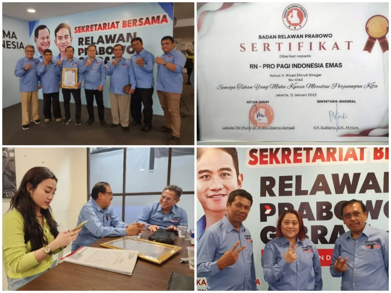 JAKARTA, (29/1) – Tim Relawan Nasional Pro Prabowo Subianto dan Gibran Rakabuming Raka calon presiden 2024 – 2029, yang mengatasnamakan dirinya sebagai RN – Pro PA – GI untuk Indonesia Emas, yang di ketuai oleh  IR. Ricad Efendi Siregar, siang ini hadir di Slipi RBP bersama jajaran pengurus dan anggota Pro PA – GI untuk mendeklarasikan dukungannya dan menerima sertifikat maklumat deklarasi. Hal ini belangsung di rumah besar relawan Prabowo 08 di Jln. Letjend S.Parman Jakarta-Barat pada Senin 29/01/2024.