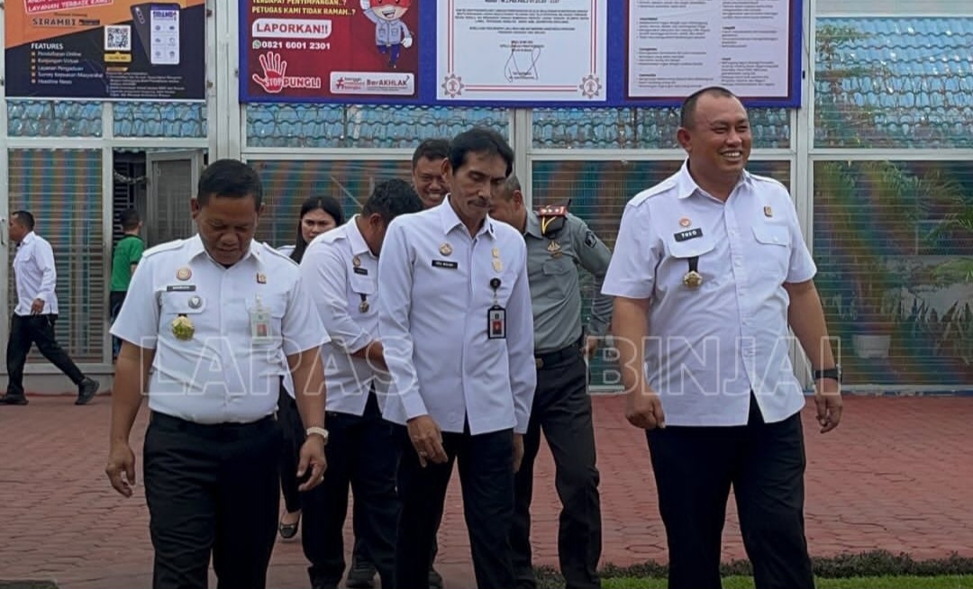 Kepala Lembaga Pemasyarakatan Kelas IIA Binjai, Theo Adrianus beserta jajaran menyambut kedatangan Irwil V, Pria Wibawa, membawa langsung Irwil V meninjau pelaksanaan Desk Evaluasi yang berlangsung di Aula Lapas Binjai.