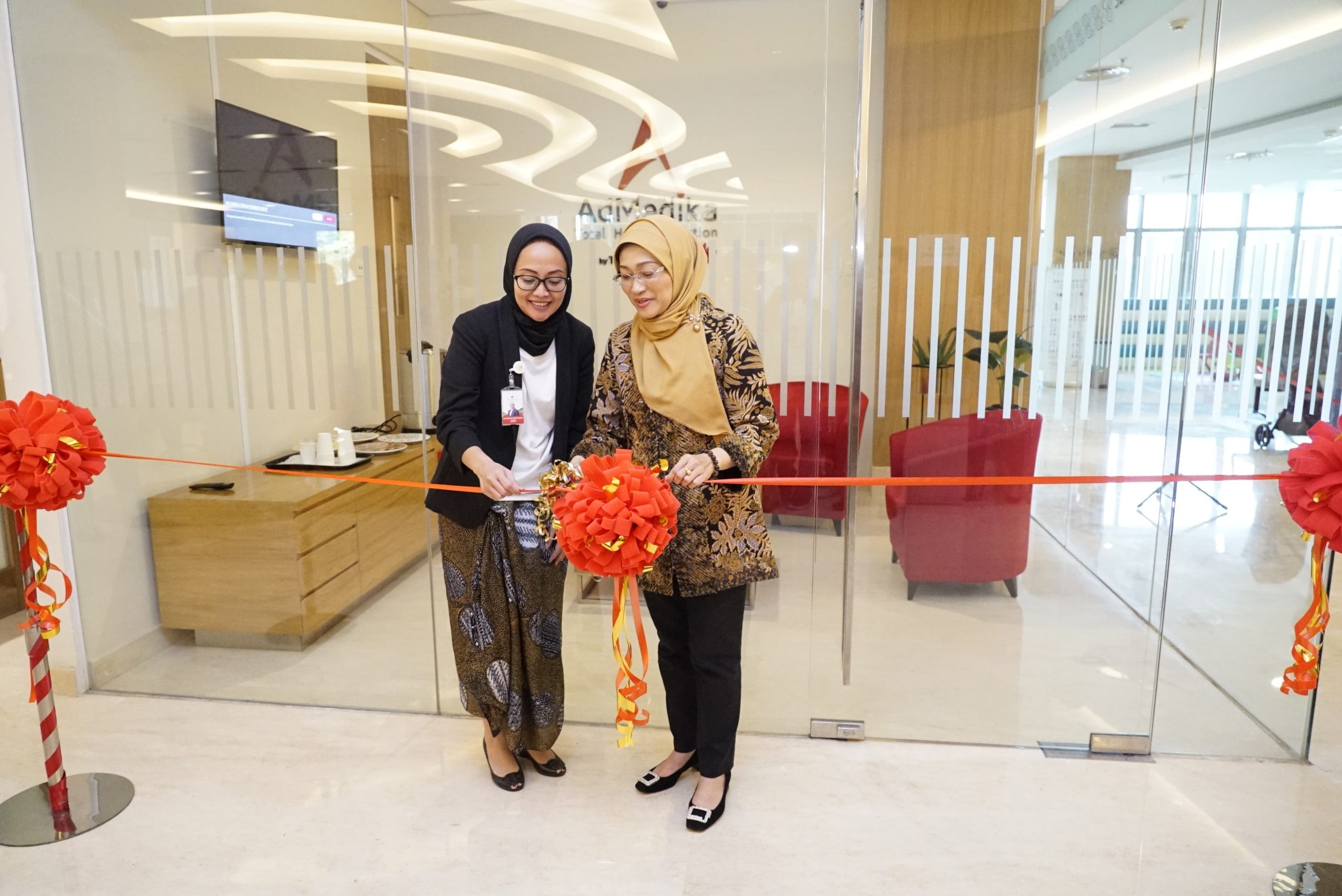 CEO AdMedika Dian Prambini bersama Direktur Eka Hospital Cibubur dr. Sheirly Novan Indra, MARS melakukan proses pemotongan pita yang menandakan peresmian pembukaan Executive Lounge di Eka Hospital Cibubur. Pembukaan Executive Lounge ini juga menjadi bentuk penghargaan AdMedika terhadap pelanggan yang telah mempercayakan kebutuhan kesehatan mereka.