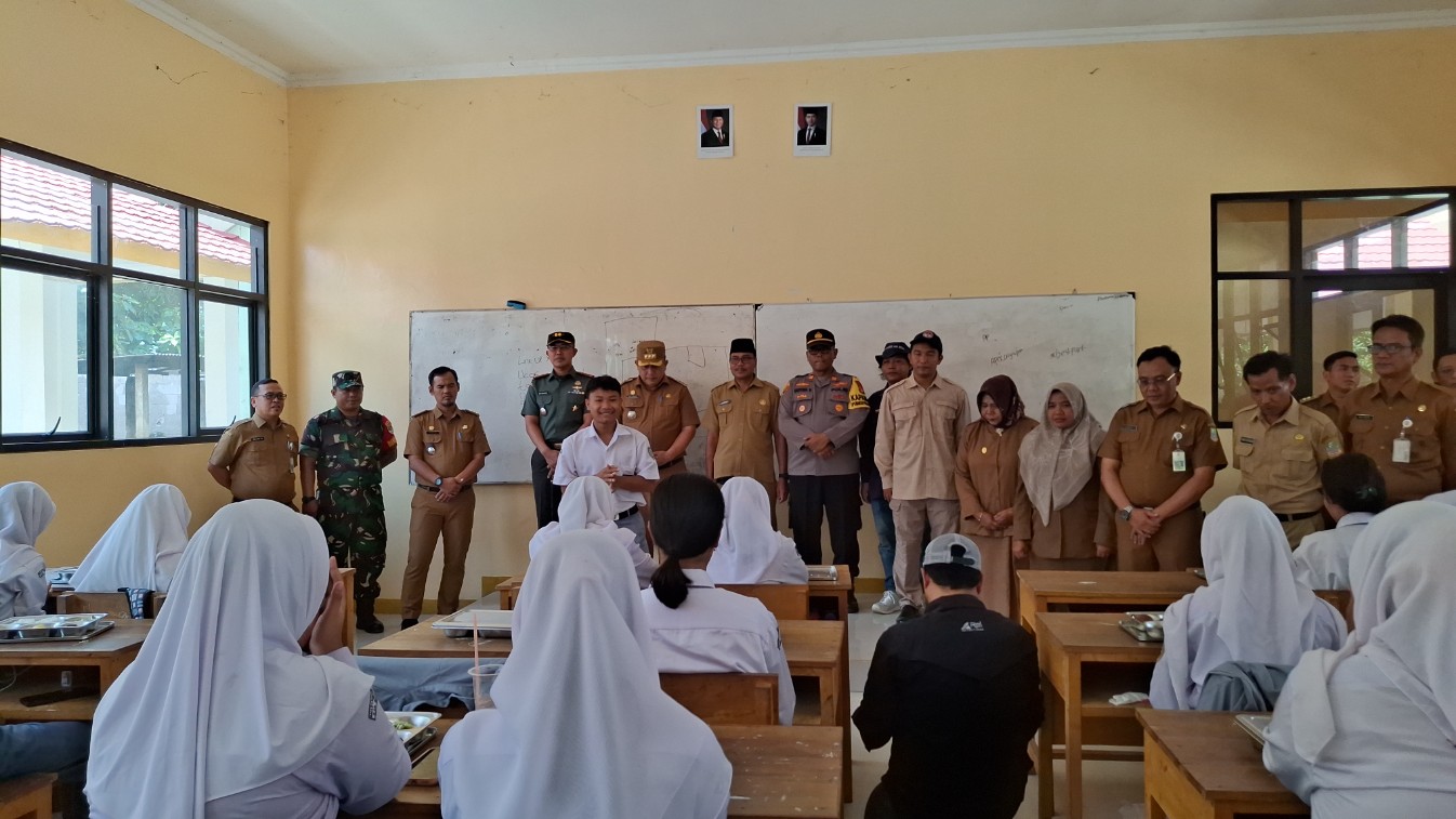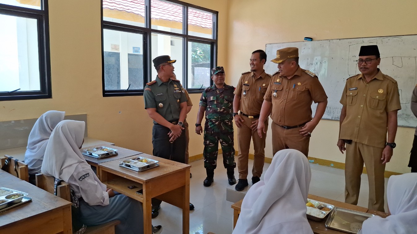 PJ Bupati Bekasi dan Dandim 0509 Kabupaten Bekasi tiba di SMAN 1 Pebayuran dan langsung meninjau pelaksanaan program. Mereka mengecek beberapa kelas untuk memastikan program Makan Bergizi Gratis.