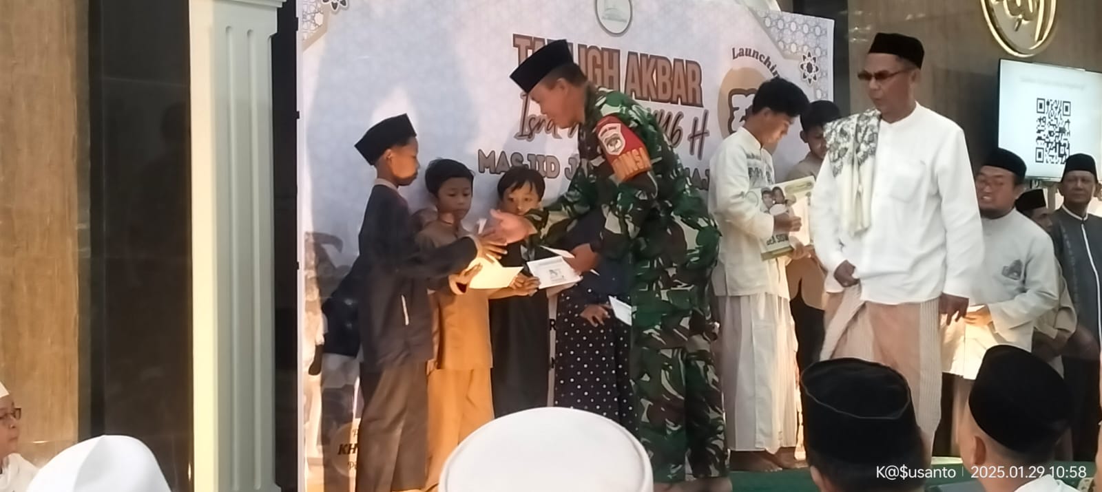 Cikarang Barat, – Babinsa Desa Telajung, Serma Mat Khairat dari Koramil 05 Cibitung, menghadiri kegiatan peringatan Isra Mi’raj Nabi Muhammad SAW 1446 Hijriah di Masjid Al-Muhajirin, Desa Telajung, Kecamatan Cikarang Barat, pada Rabu pagi (29/1/2025). Acara yang mengusung tema “Menuju Masjid Sebagai Pusat Peradaban dan Solusi Problematika Umat” ini dihadiri oleh tokoh agama, masyarakat, serta para dermawan yang turut memberikan santunan kepada anak yatim piatu.
