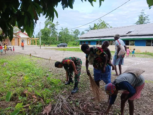 Timika – Dalam upaya mempererat hubungan dengan masyarakat sekaligus menjaga kebersihan lingkungan, Babinsa Koramil 1710-07/Mapurujaya, Pelda Sumantri dan Sertu Tangkas Budiono, mengajak warga melaksanakan gotong royong membersihkan halaman Gereja Santu Mikhael di Kampung Hiripau, Jumat (10/4/2026).