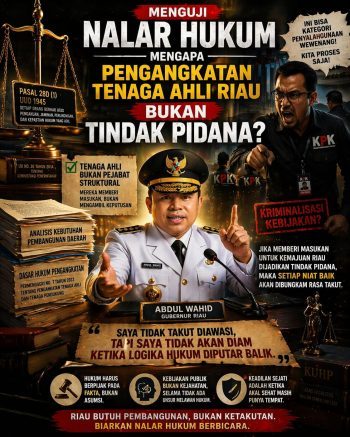 Narasi yang dibangun oleh Jaksa Penuntut Umum (JPU) seolah-olah ingin menggiring opini publik bahwa kebijakan pengangkatan tersebut adalah sebuah “perbuatan melawan hukum” hanya karena tidak lagi dianggarkan dalam APBD Riau sejak tahun 2025.
